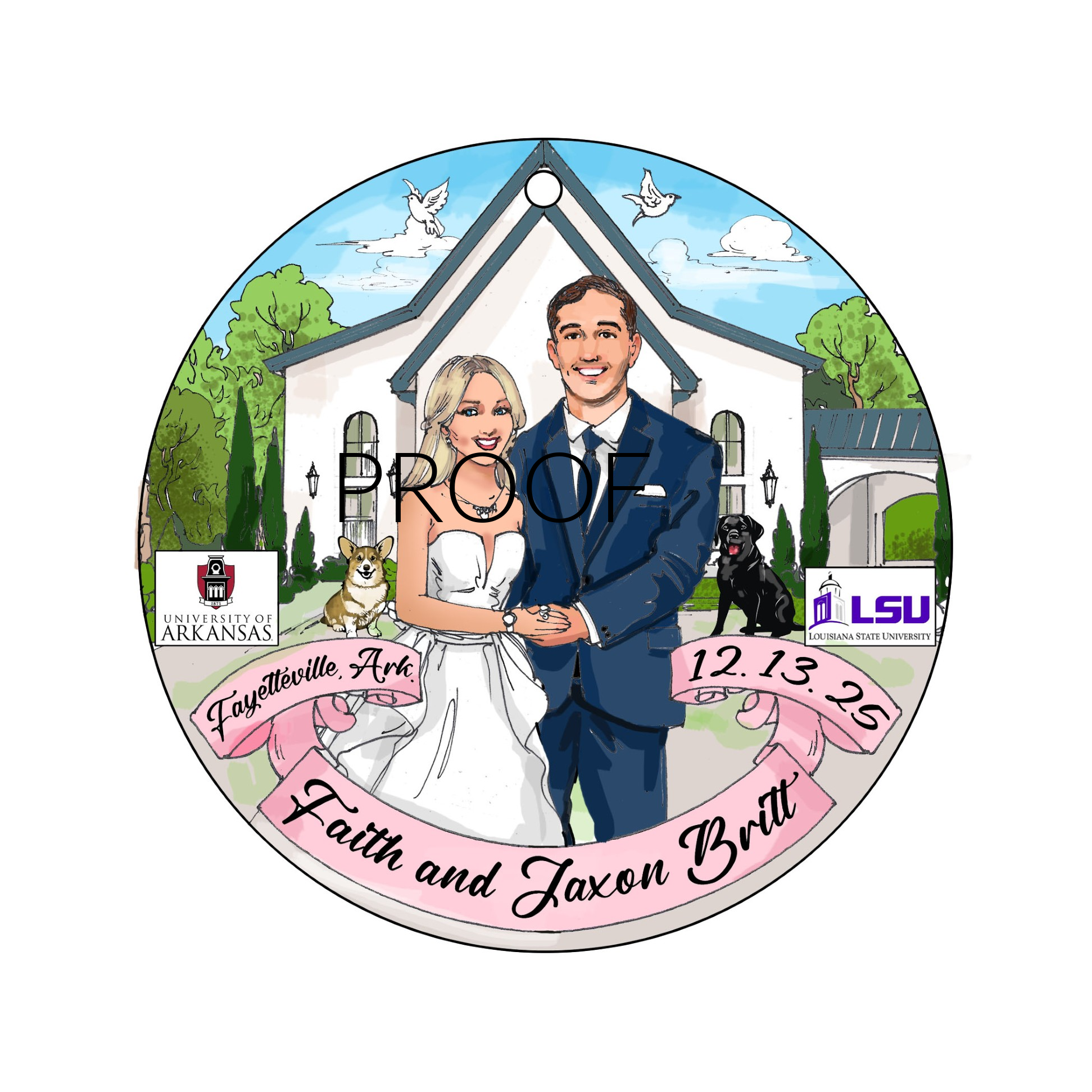 If we are creating a custom drawing of the couple, (see Peyton/Beau, Bailey/Chris, Mary/Rene examples) once you place your order, please email: your favorite 2 inspiration photos of the couple, wedding location, wedding colors, theme, year of wedding, fun details we should know, with your order number to: FrillSeekersgifts@cox.net The cost for our artists to design and create the custom artwork is $195. which includes 1 complimentary proof. If additional changes are made, additional design fee $25.00 will apply, if the information was not included in the original order details.